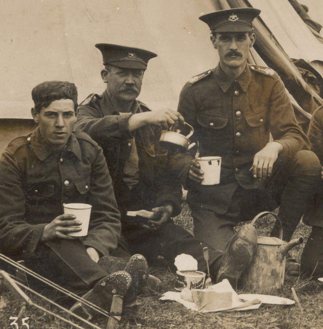 A group of men from the 5th (Derby) Battalion are seen drinking tea and eating bread with tinned raspberry jam and pineapple. The stone wall in the background is typical of those in Derbyshire and suggests that this picture was taken in 1910.