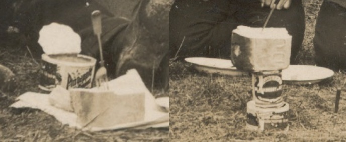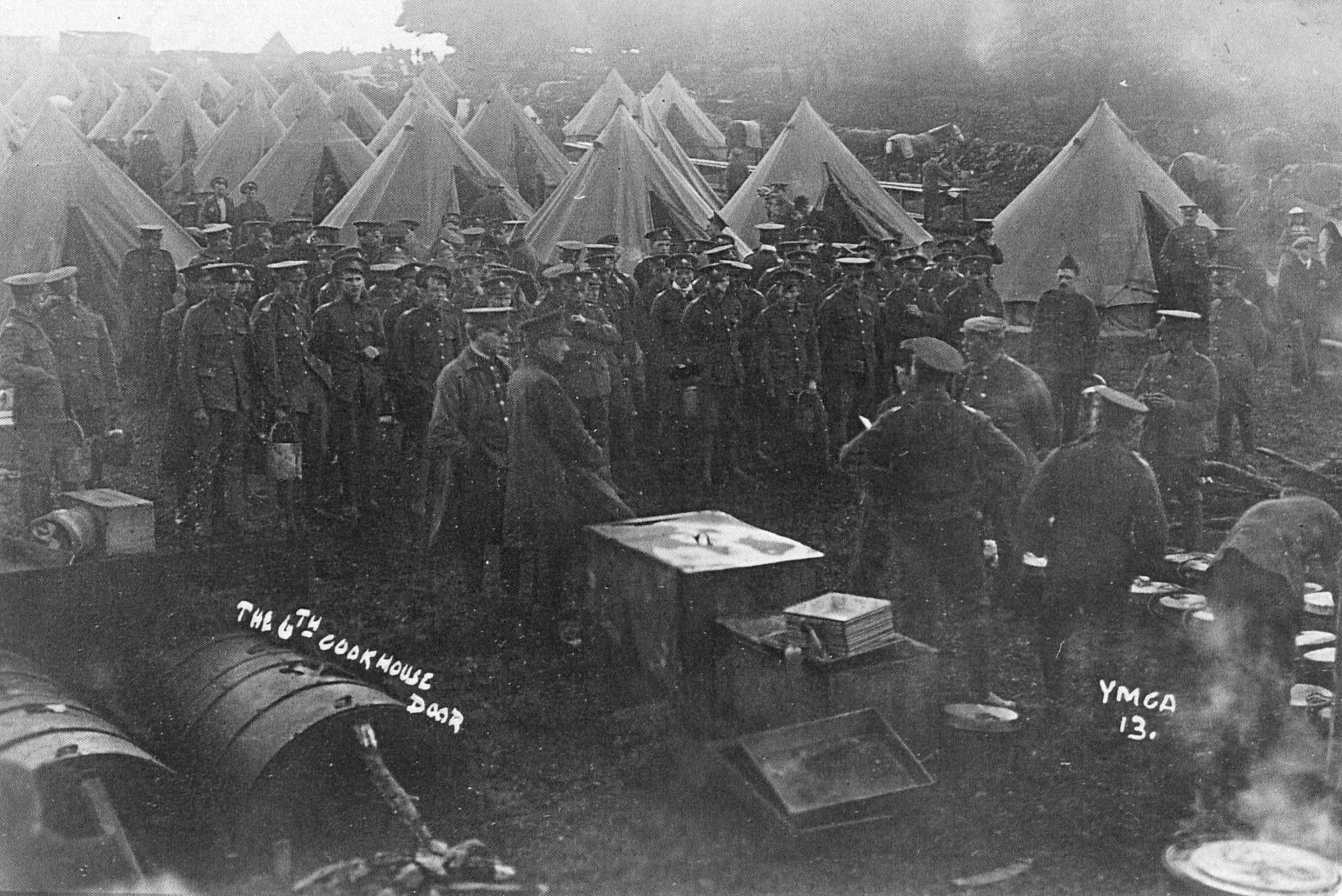 Having reached Camp the men are keen to eat . During the Camp, 65 tons of meat and 12,000 half-quartern loaves (a loaf having a weight when baked of 800g) were consumed. Each Territorial Soldier paid one shilling per day to the mess fund for ‘extras’ such as tea, potatoes, milk sugar and bacon. Meal times during Camp were generally; breakfast at 8 am, dinner at 2.30 pm and tea at 5 pm. 116 Sergeant George Hoult of G Company and 19 assistants provided hot meals for the 980 men of the Battalion that were in Camp. In order to do this they used a combination of Aldershot ovens (seen at bottom left of the picture) and camp kettles. The High Peak news reported that “the men had never been fed so well at Camp before”