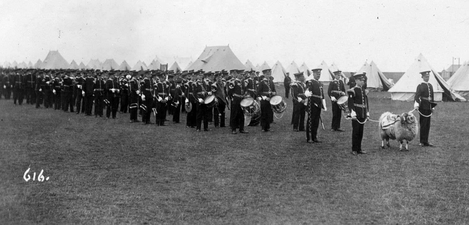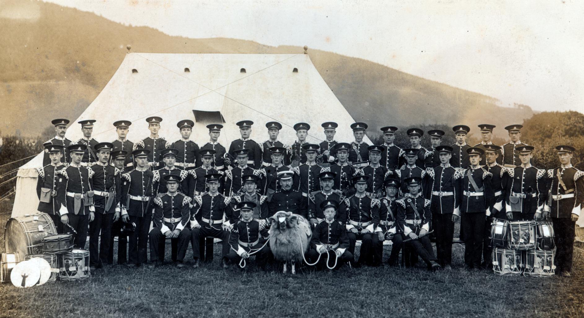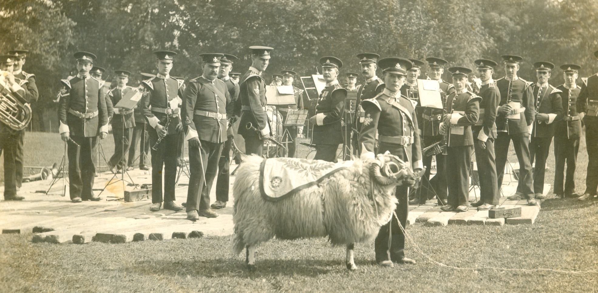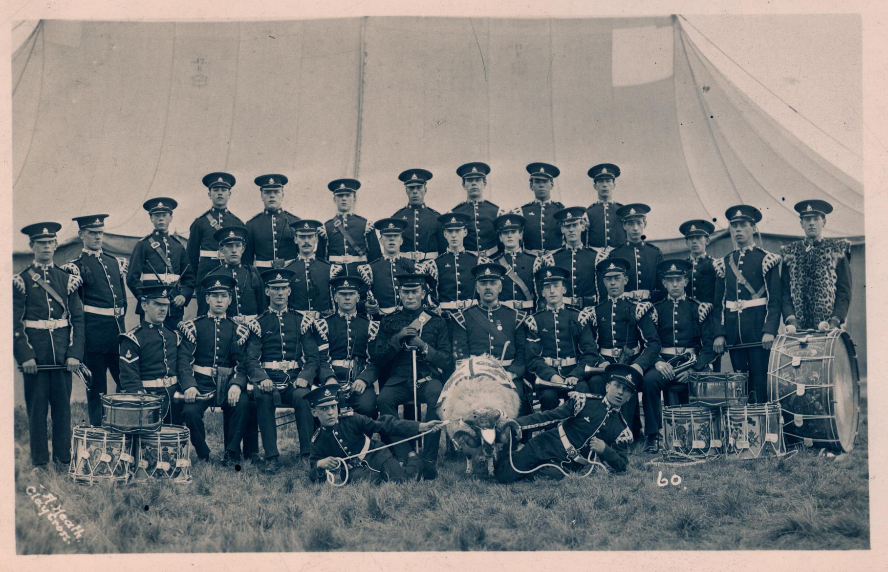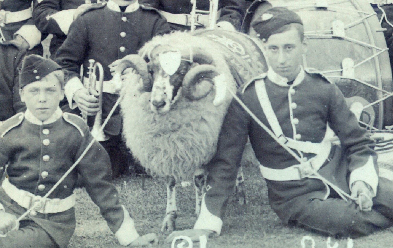 RamClose up view of the Regimental Pet and two young bandsmen. The presence of Duke I on this photographs confirms that it was taken prior to 1906.
