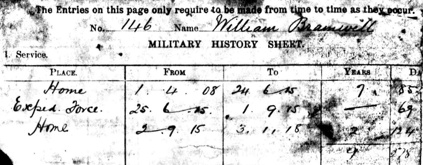 146 Bramwell overseasWilliam arrived in France with the 1st Reserve Reinforcement in June 1915 and was transferred back to England in September 1915. He was posted to the 3/6th Battalion in October 1915 and then later to the 5th Reserve Battalion before being discharged in January 1918.