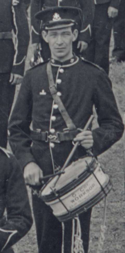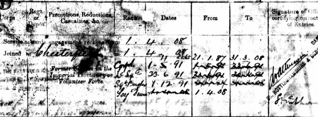 146 Bramwell VolunteerWilliam enlisted into the 2nd Volunteer Battalion, the Derbyshire Regiment in January 1887 and was issued with the Regimental Number 2265. He was promoted to Corporal (May 1891), Lance Sergeant (June 1891) and Sergeant Bugler (December 1891). William re-enlisted into the 6th Battalion Sherwood Foresters as a Sergeant Drummer on the 1st April 1908.