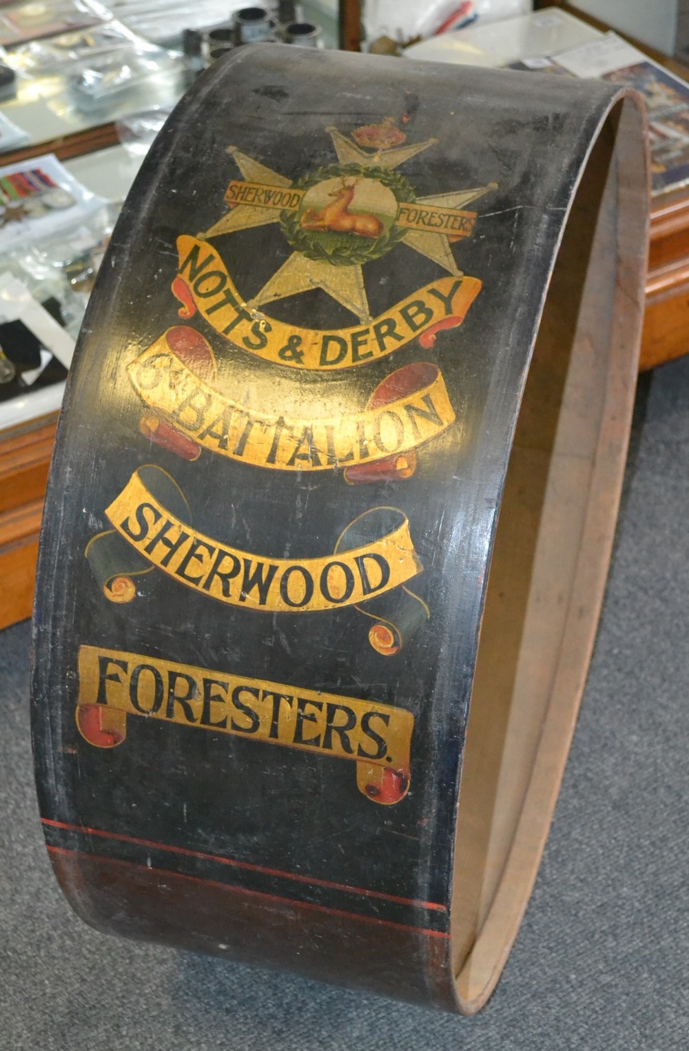 Large bass drum formerly belonging to the band of the 2nd Volunteer Battalion, The Derbyshire Regiment, which was recently sold at auction (2014).