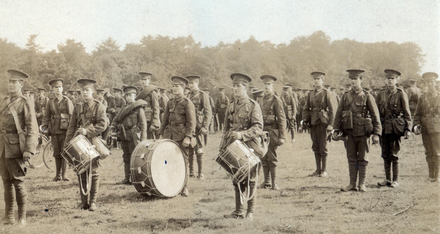 The 7th (Nottingham) Battalion, the Robin Hoods Bugle Band at Welbeck Park Camp.