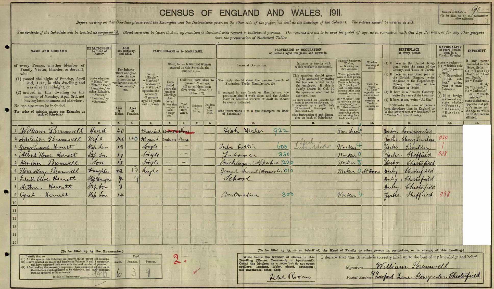 Bramwell 1911 CensusIn the 1911 Census William was living with his family at 19 Lockoford Lane in Stonegravels with his new wife Adelaide and their respective families.