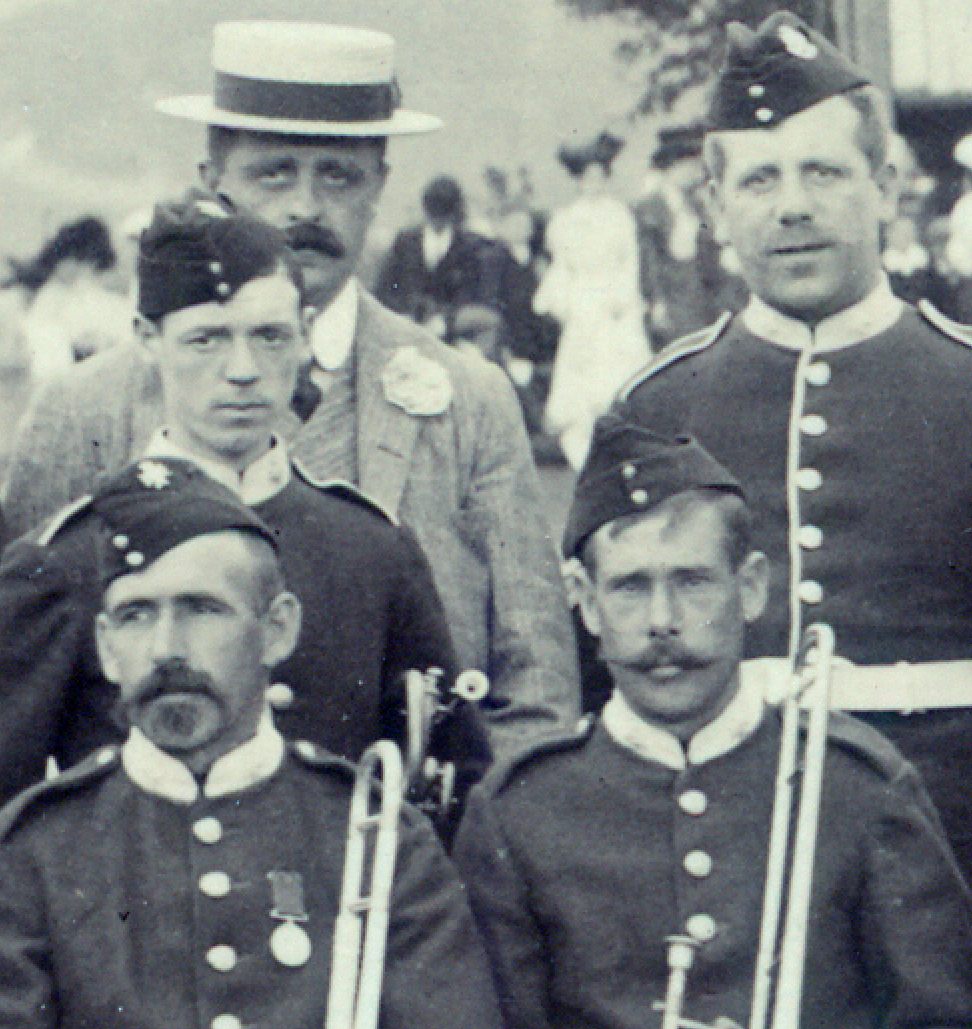 Colonel JacksonLieut.-Colonel Geoffrey Meinertzhagen Jackson is also present in Civilian Clothes. Colonel Jackson had been gazetted 2nd Lieutenant in the 2VB the Sherwood Foresters on 11th April 1891 and had been allowed an extended term of Command. Indeed, Jackson had taken over Command of the Battalion in May 1904 from Colonel Herbert Brooke-Taylor and he was instrumental in the smooth transfer from the 2nd Volunteer Battalion to the 6th Battalion Notts and Derby Regiment under the “Territorial and Reserve Forces Act of 1907”.Tuba manInteresting picture of Tuba and Ephorium players. The Tuba Corporal has a pre-1902 coloured worsted  ‘Bandsman’ Badge on his right sleeve. The Ephorium player wears the crossed rifles of a marksman.