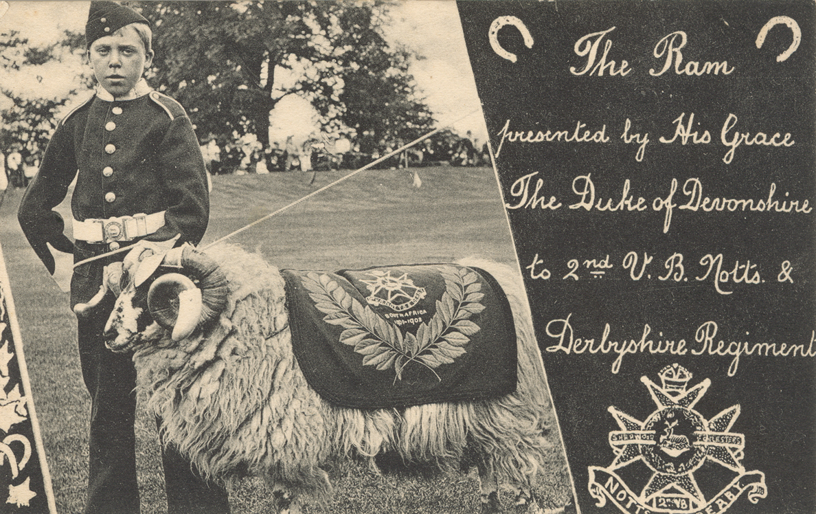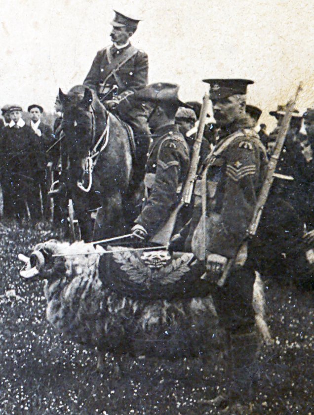 An early picture of ‘Duke’. This Mascot was presented to the Battalion by the Duke of Devonshire, who was the major land owner in the high peak region of Derbyshire. His reigns are being held by a young recruit and they are standing on what appears to be manicured lawns suggesting that the presentation may be taking place at Chatsworth House. Interestingly, the saddle shows the Battle Honours of South Africa, which were won by a selected contingent of the 2nd Derbyshire Volunteer that served under Captain Geoffrey Goodman.